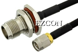 Our male SMA to female TNC bulkhead cable assembly uses a formable cable type that is 50 Ohm. EZCON SMA male to TNC female bulkhead cable assembly is constructed with SR402FLJ coax.