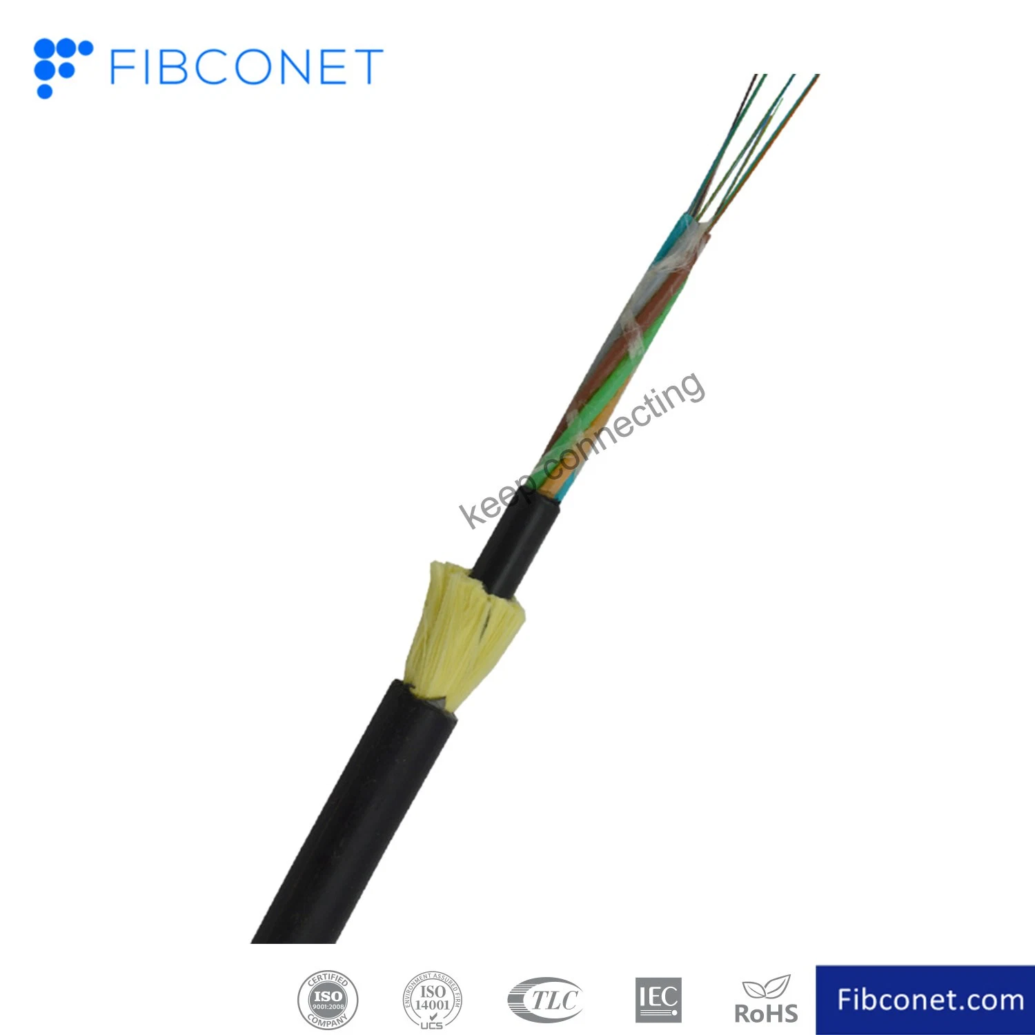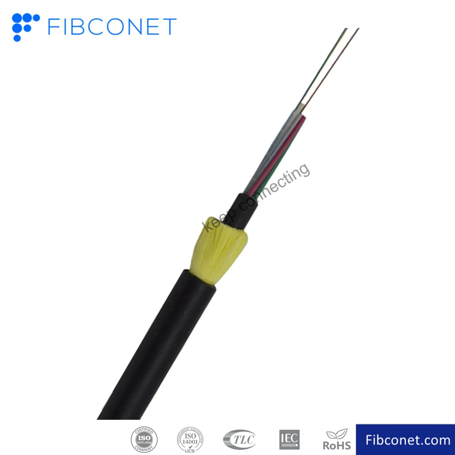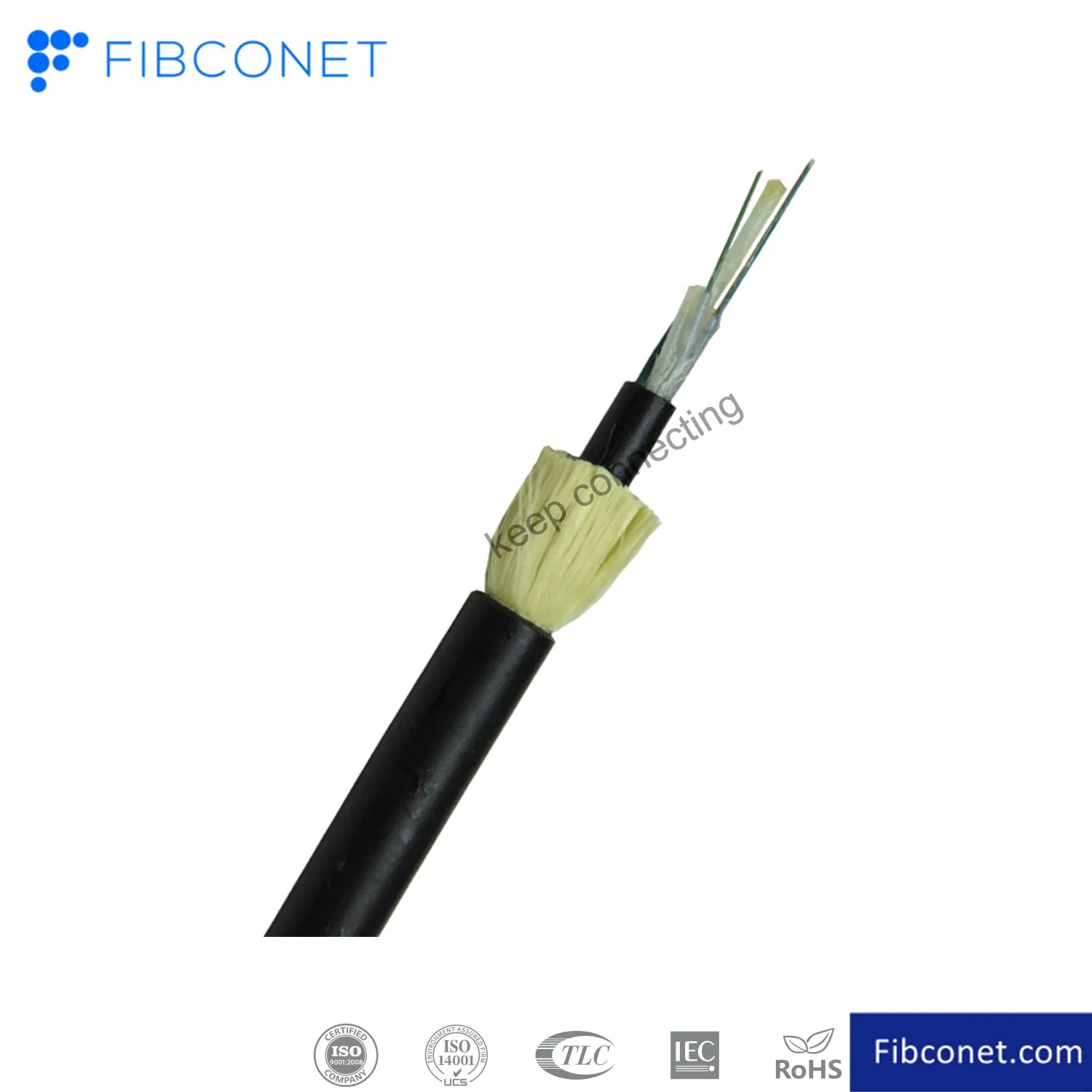 DescriptionAll Dielectric Self-supporting Aerial Cable is loose tube stranded. 200um or 250um fiber , is positioned into a loose tube which made of high modulus plastics. The tubes are filled with a water-resistant filling compound. The tubes (and fillers) are stranded around a FRP (Fiber Reinforced Plastic) as a non-metallic central strength member into a compact and circular cable core. After the cable core is filled with filling compound. it is covered with thin PE (polyethylene) inner sheath. After stranded layer of aramid yarns are applied over the inner sheath as strength member, the cable is completed with PE or AT (anti-tracking) outer sheath.