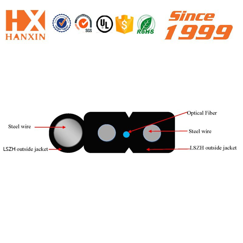 The optical fiber unit is positioned in the centre. Two parallel Fiber Reinforced Plastics (FRP) are placed at the two sides. A steel wire as the additional strength member is also applied. Then the cable is completed with a black or color LSZH sheath.