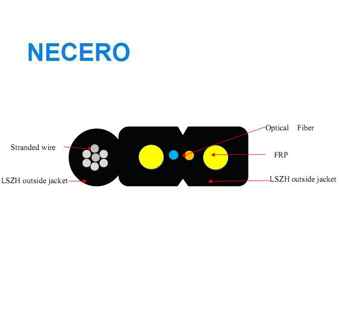 The optical fiber unit is positioned in the centre. Two parallel Fiber Reinforced Plastics (FRP) are placed at the two sides. A steel wire as the additional strength member is also applied. Then the cable is completed with a black LSZH sheath.